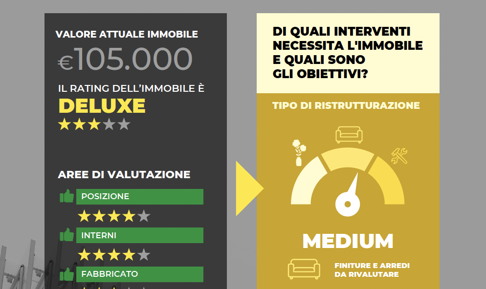 Registrati, scegli il tuo piano, scarica concept e rating degli interni. Vendere un immobile proponendo già scelte di rivalutazione ti aiuterà ad accelerare la compravendita.